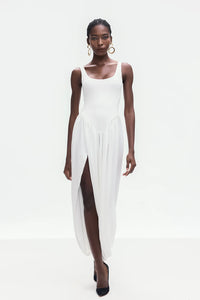 Diseño maxi con silueta ajustada en la parte superior y falda amplia drapeada